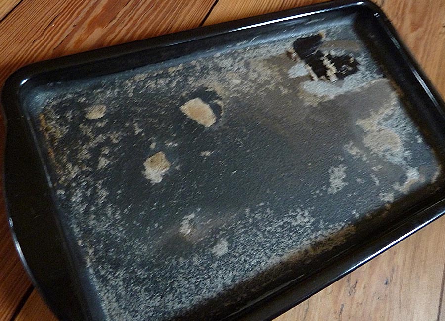 Die abgefilterte Flüssigkeit war bei mir nicht ganz klar geworden, ich hab sie trotzdem genommen und eingekocht, bis ich nur noch etwa 100 ml hatte. Das fühlte sich schon sehr seifig und ätzend an. Dies habe ich dann auf mein Emaillbackblech gegeben, damit es auskristallisiert und zu Pottasche wird. Dazu habe ich es in den Holzbackofen bei offener Tür gestellt. Eventuell war das zu heiß, weil es nicht ganz gelang oder die Flüssigkeit doch noch zu unrein. An einigen Stellen waren zwar ein paar Kristalle zu sehen, der Rest war aber eine schleimige, bräunliche Paste.